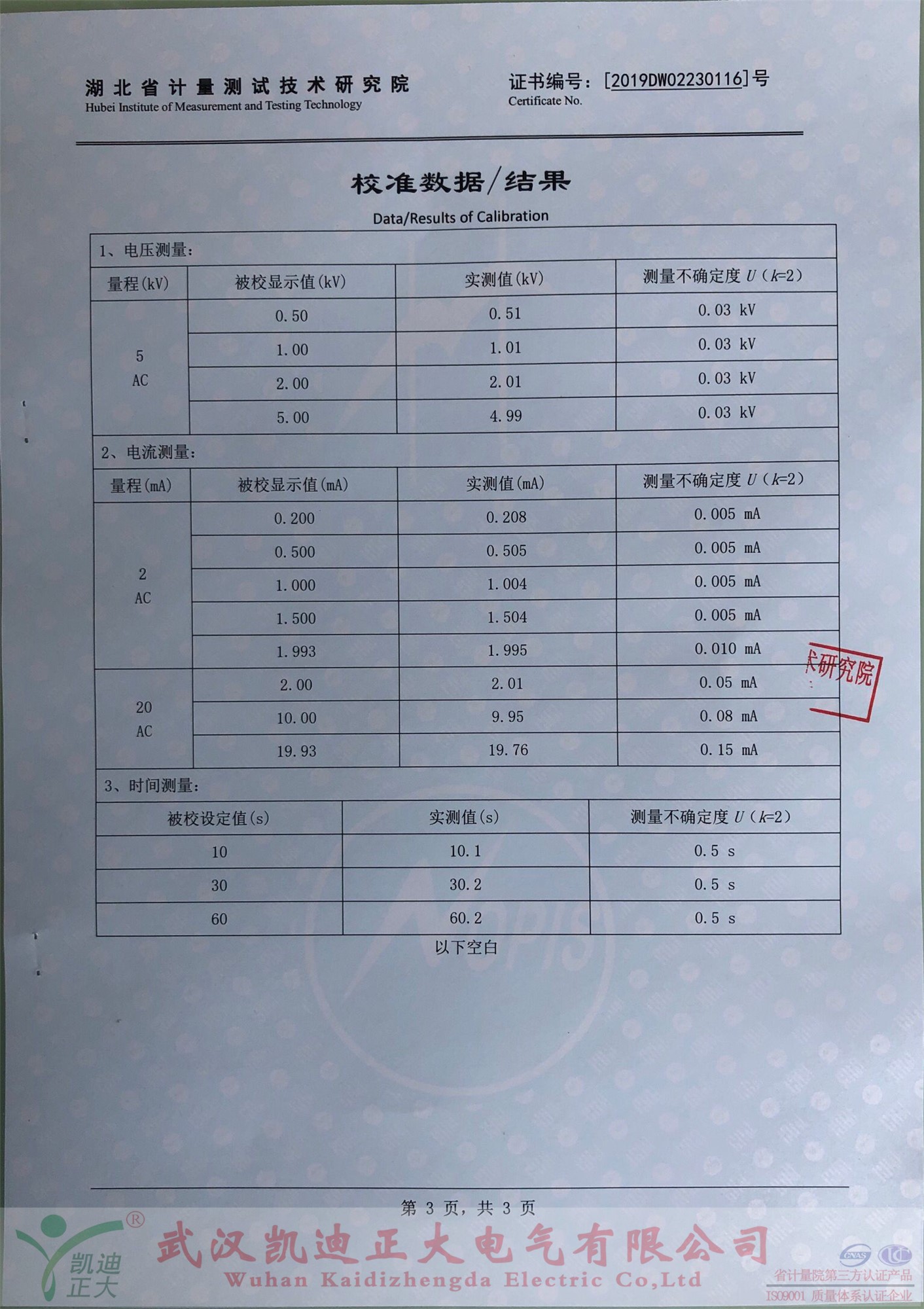 購買后便送往中國校準服務聯(lián)合體-湖北省計量測試技術研究院檢定,由省計量院出具的《校準證書》,證書編號:2019DW02230116,校準員:李艷,檢驗員:嚴偉,證書批準人:耿睿。