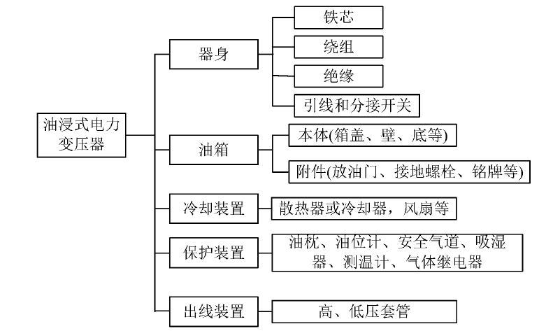 油浸式電力變壓器主要由器身、油箱、冷卻裝置、保護裝置、出線裝置等幾部分構成,具體如圖所示: