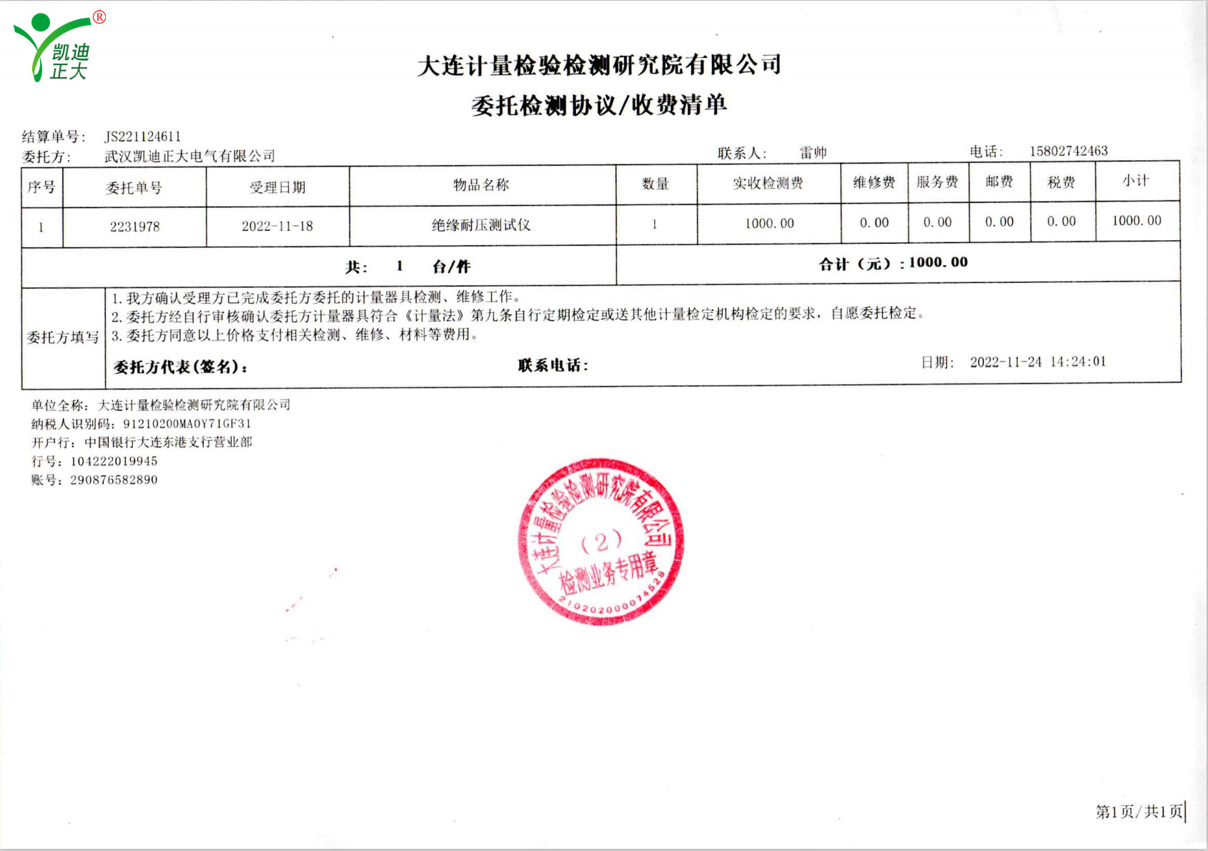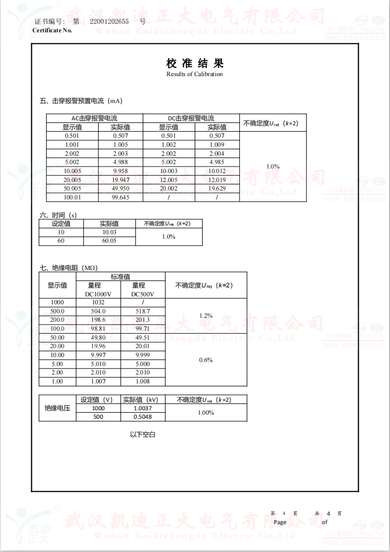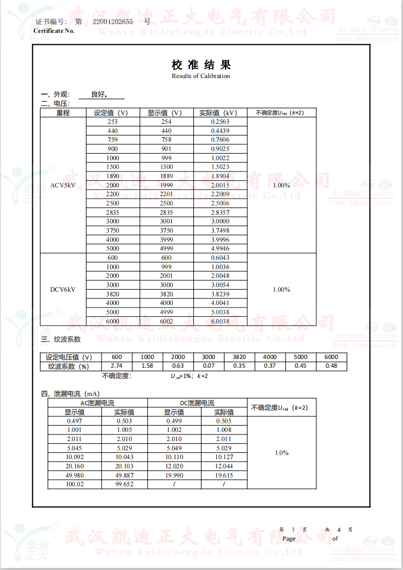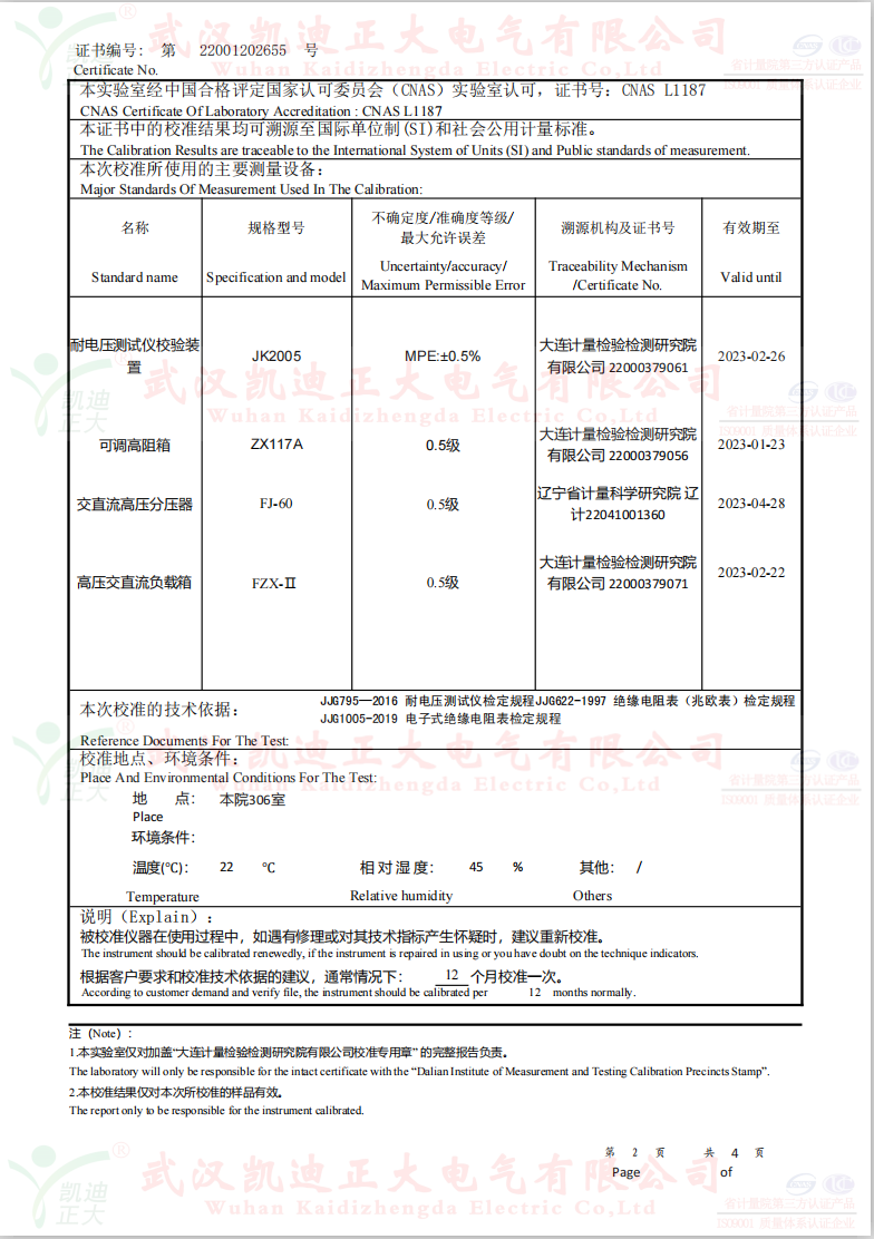 低壓成套開(kāi)關(guān)柜KD7742智能耐壓絕緣測(cè)試儀根據(jù)公司制度標(biāo)準(zhǔn)需要獲得中國(guó)認(rèn)可國(guó)際互認(rèn)校準(zhǔn)CNAS檢定機(jī)構(gòu),大連計(jì)量檢驗(yàn)檢測(cè)研究院有限公司出具《KD7742智能耐壓絕緣測(cè)試儀校準(zhǔn)證書(shū)》,證書(shū)編號(hào):第22001202655號(hào);使用耐電壓測(cè)試儀校驗(yàn)裝置(溯源機(jī)構(gòu)大連計(jì)量檢驗(yàn)檢測(cè)研究院)、ZX117A可調(diào)高阻箱(溯源機(jī)構(gòu)大連計(jì)量檢驗(yàn)檢測(cè)研究院)、FJ-60交直流高壓分壓器(溯源遼寧省計(jì)量科學(xué)研究院)、FZX-II高壓交直流負(fù)載箱(溯源機(jī)構(gòu)大連計(jì)量檢驗(yàn)檢測(cè)研究院)等檢定設(shè)備。