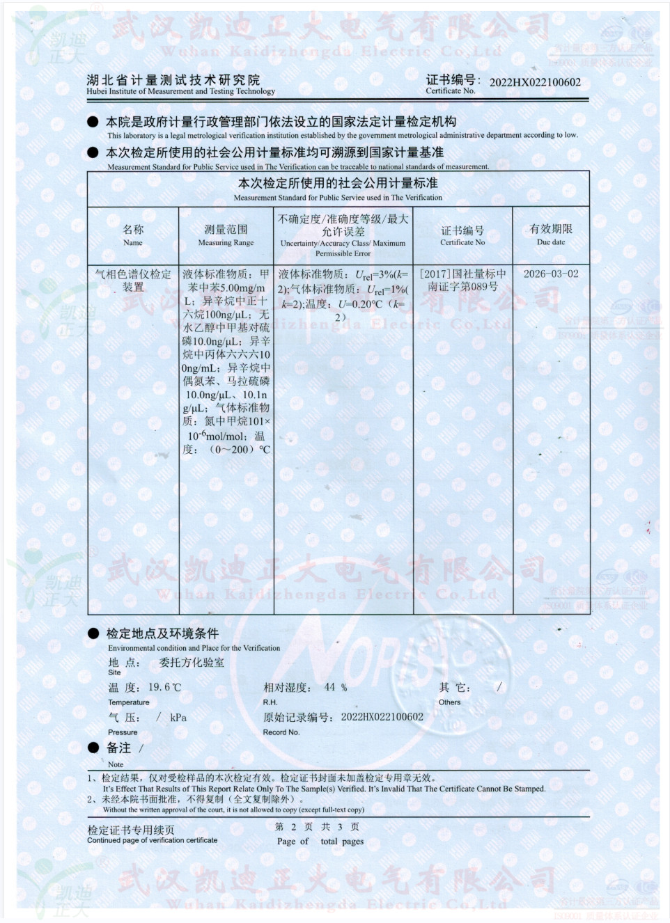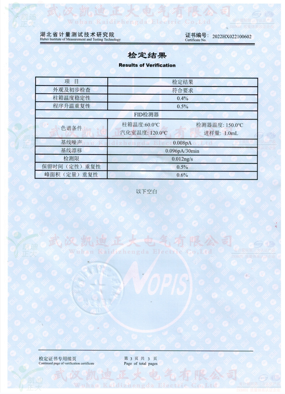 獲得國(guó)網(wǎng)湖北省電科院蔡工的青睞,了解了色譜儀的性能后,要求設(shè)備獲得湖北省計(jì)量院檢定報(bào)告。2022年10月,我司生產(chǎn)好KDZD9560氣相色譜儀后,按照J(rèn)JG700-2016《氣相色譜儀檢定規(guī)程》進(jìn)行送檢,檢定結(jié)果為合格。送檢單位電力工業(yè)電氣設(shè)備質(zhì)量檢驗(yàn)測(cè)試中心,計(jì)量器具KDZD9560氣相色譜儀符合相關(guān)標(biāo)準(zhǔn)。