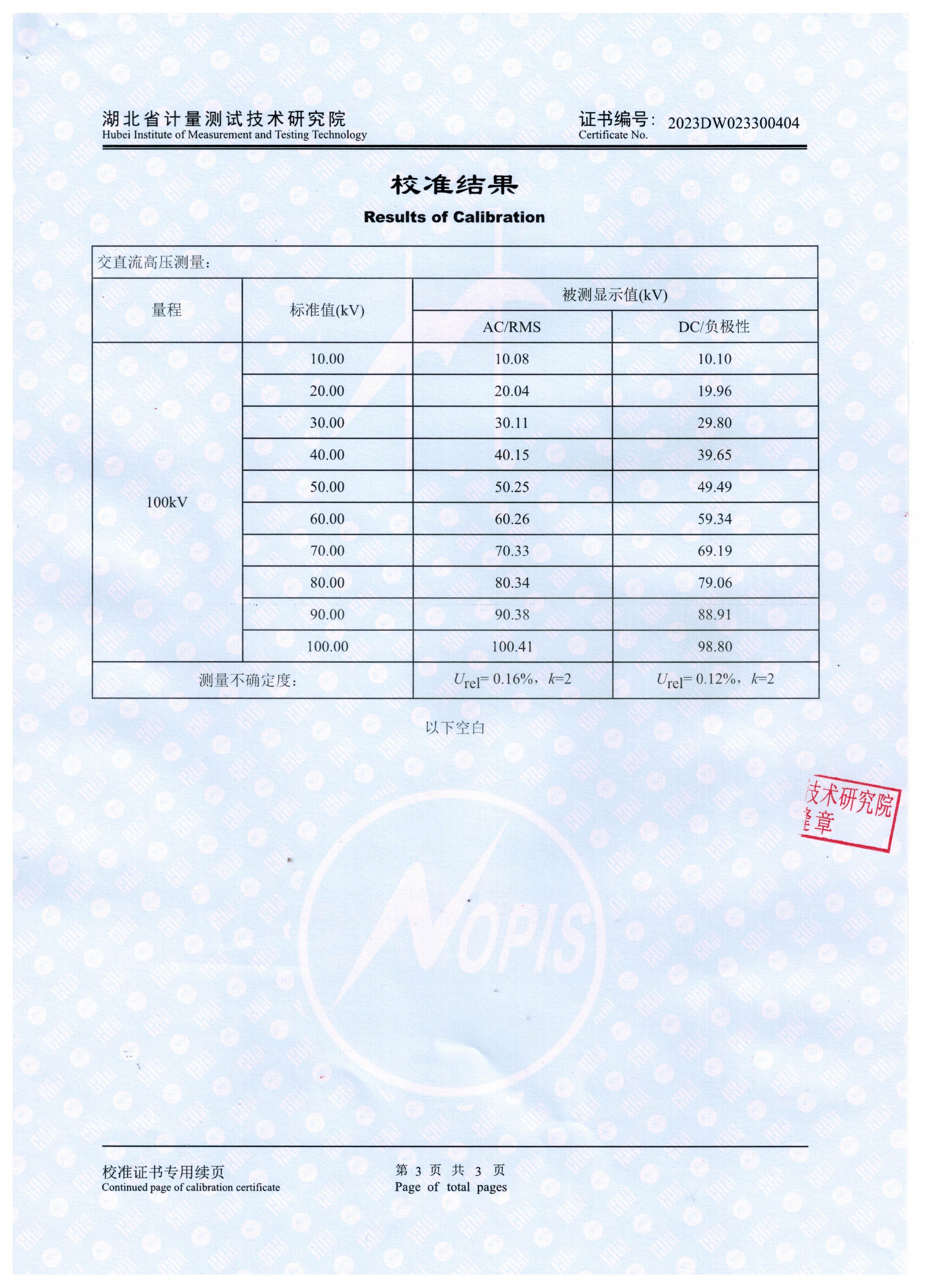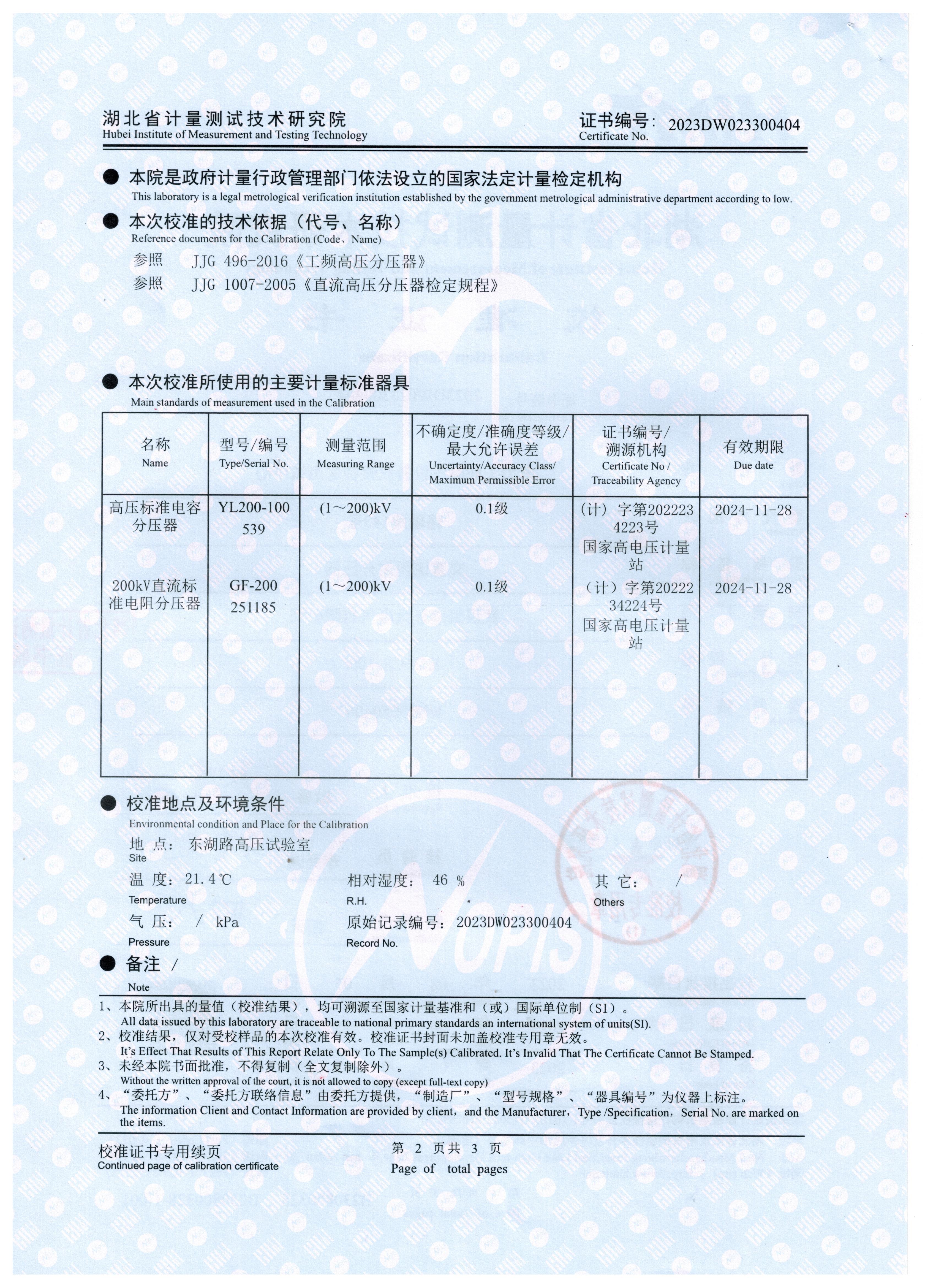 參照 JJG 496-2016 《工頻高壓分壓器》、JJG 1007-2005《直流高壓分壓器鑒定規程》 檢定要求,KDFCR-100 交直流兩用分壓器獲得證書2023DW023300404檢定證書。