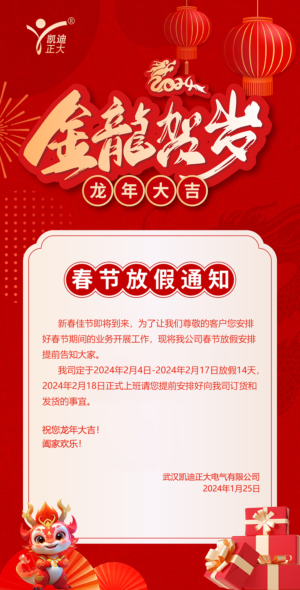 2024年武漢凱迪正大春節放假通知