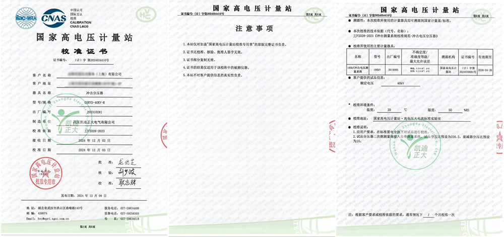 近日,武漢凱迪正大電氣的脈沖電壓測試設備中的沖擊分壓器,順利通過國家高電壓計量站的校準,并獲得校準證書。這一成果標志著該設備在測量精度、穩定性和可靠性方面達到相關標準,為電力設備絕緣性能檢測提供了強有力的技術支撐,進一步推動電力安全檢測領域的發展。