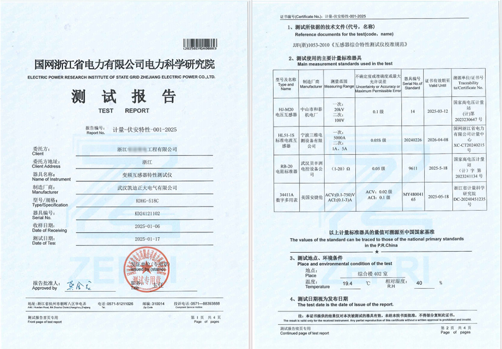 校準(zhǔn)圍繞對儀器的變比精度、角差控制、伏安特性曲線擬合度等核心指標(biāo)進(jìn)行了多場景模擬測試。KDHG-518C變頻互感器特性測試儀具有操作簡便、功能全面、測試精準(zhǔn)等特點(diǎn),廣泛應(yīng)用于各類CT(電流互感器)和PT(電壓互感器)的性能測試。此次通過國網(wǎng)浙江省電力有限公司電力科學(xué)研究院的校準(zhǔn),充分證明了KDHG-518C在技術(shù)指標(biāo)、測試精度和穩(wěn)定性等方面的可靠表現(xiàn)。